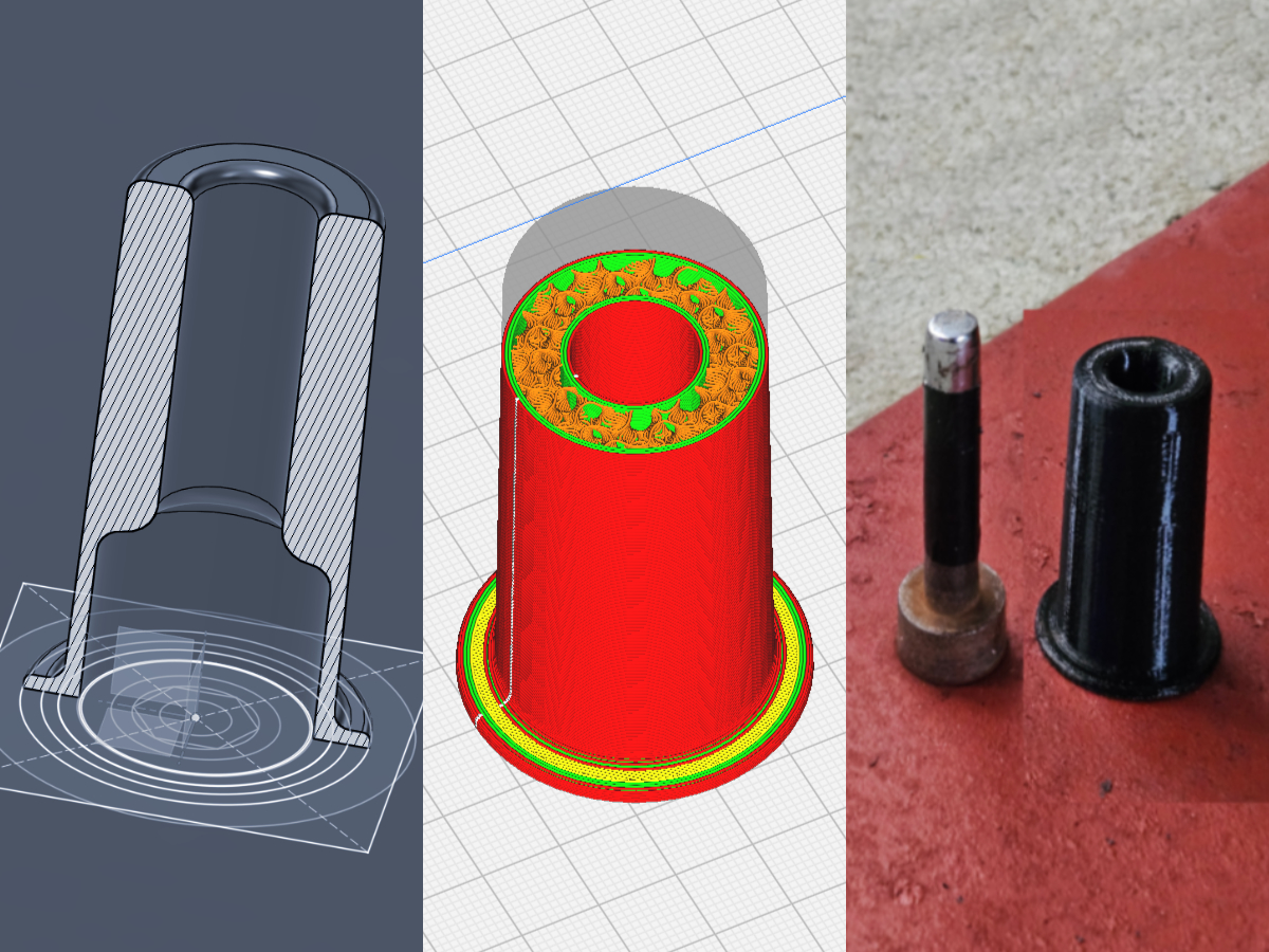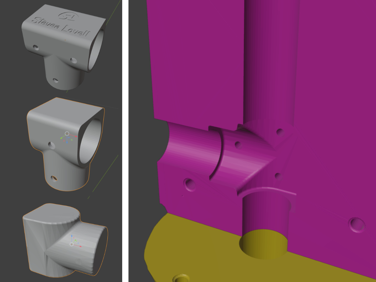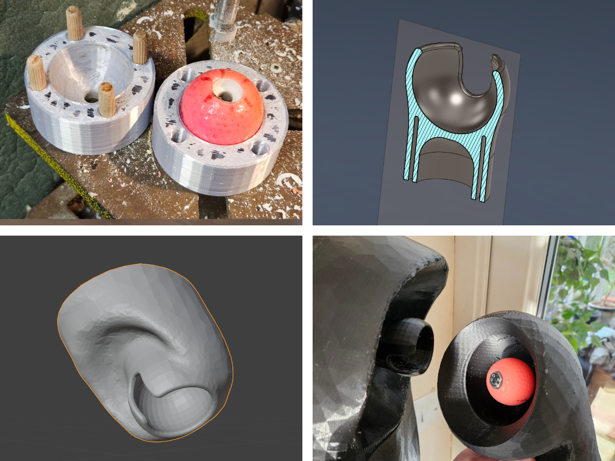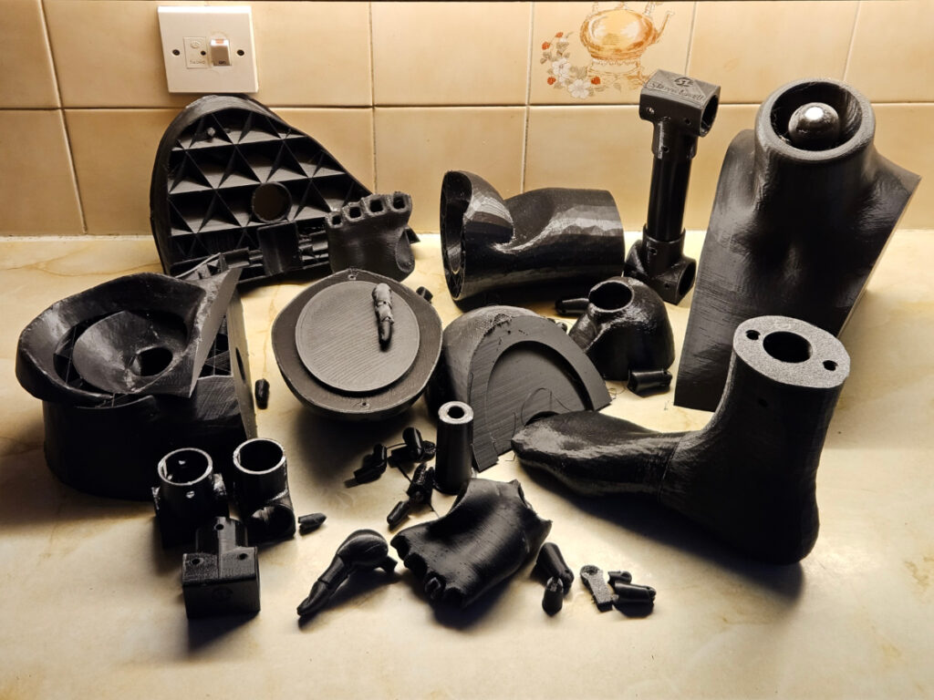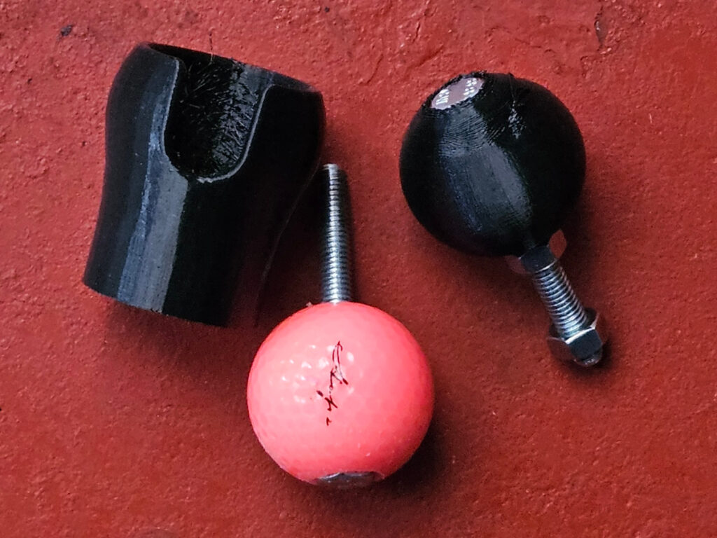 Materials: PLA plastic, TPU plastic, Hot Glue, Wood Dowels, PVC Pipe, various bolts and screws. A few solid golf balls.