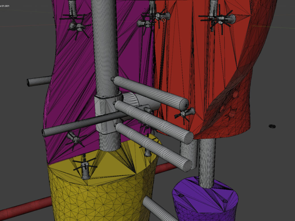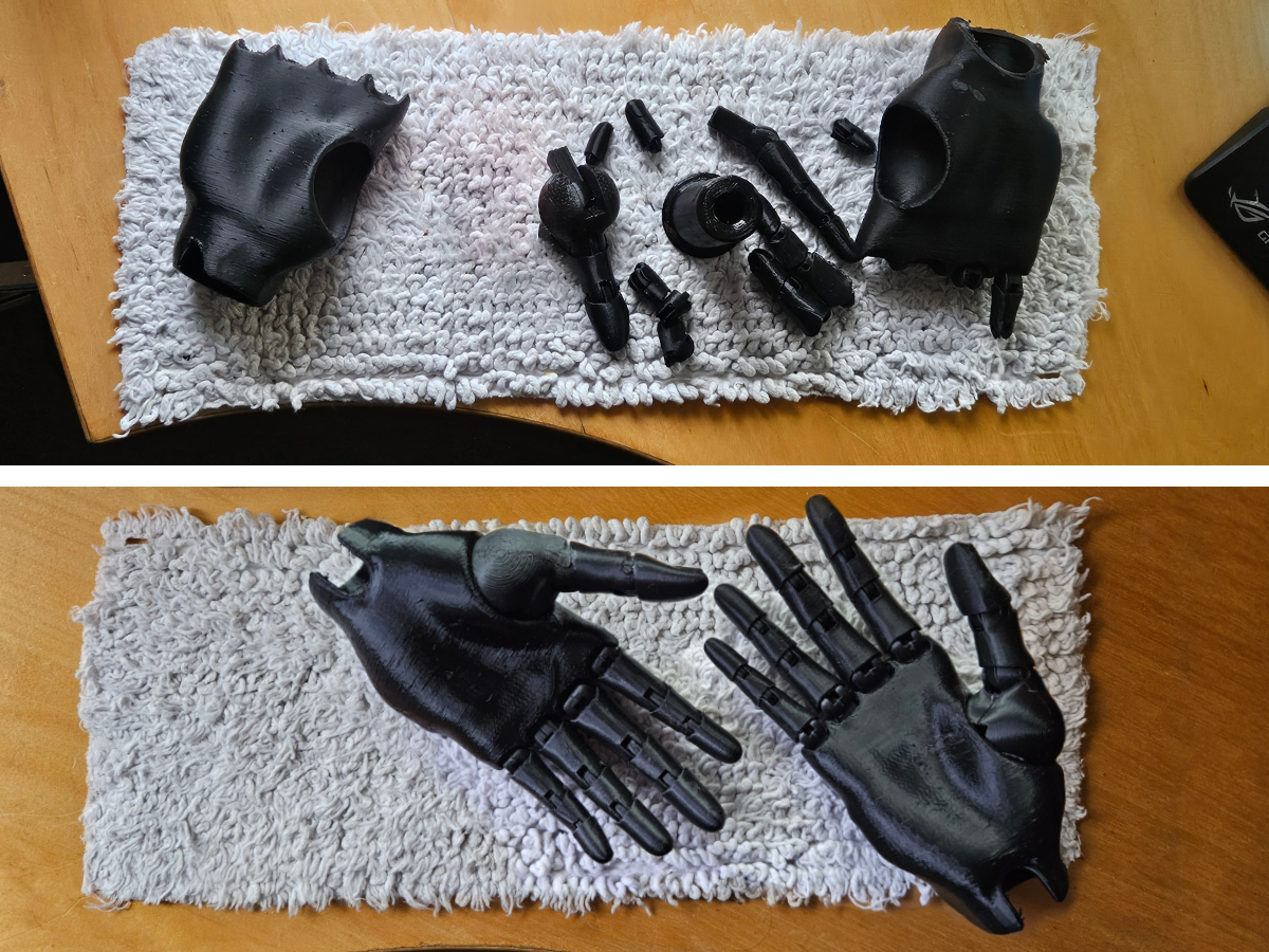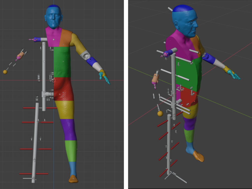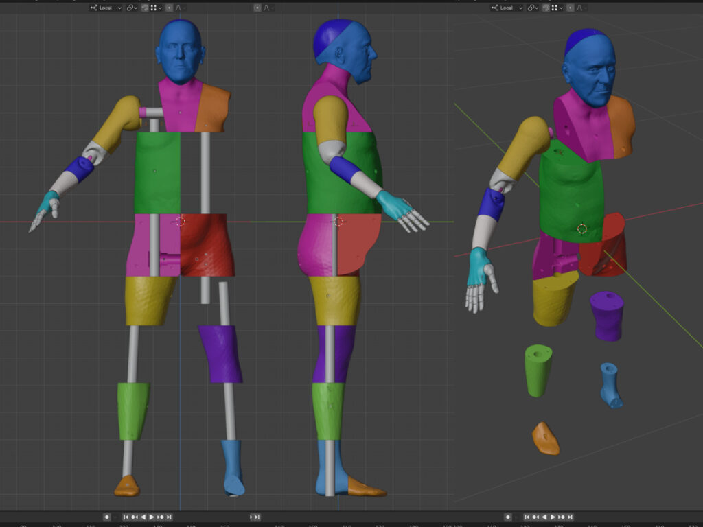 This image shows the joints all finished but for quite a while, it was just useless flat cuts between body parts. It still needed alignment dowel holes and functioning joints. Coming up with posable joints was a right old chore and I don’t work well or efficiently in 3D.
