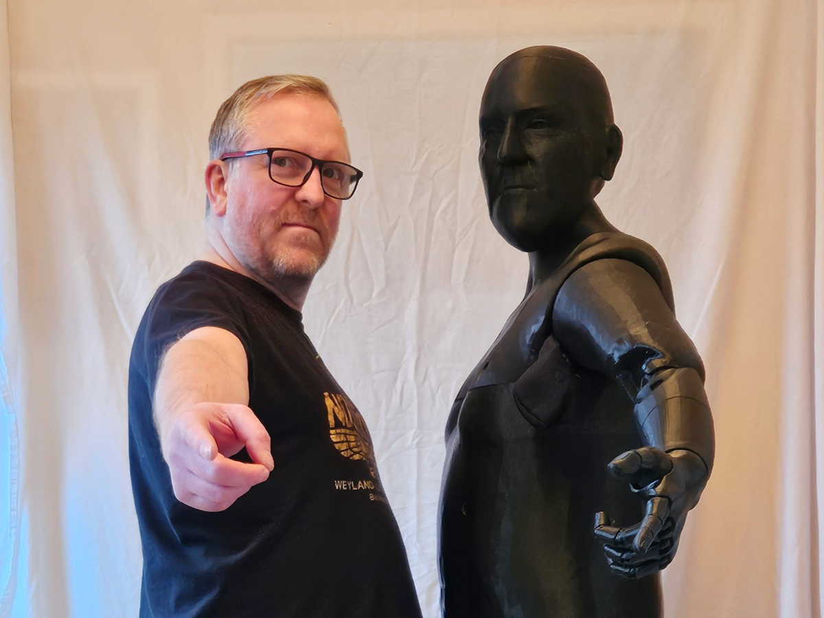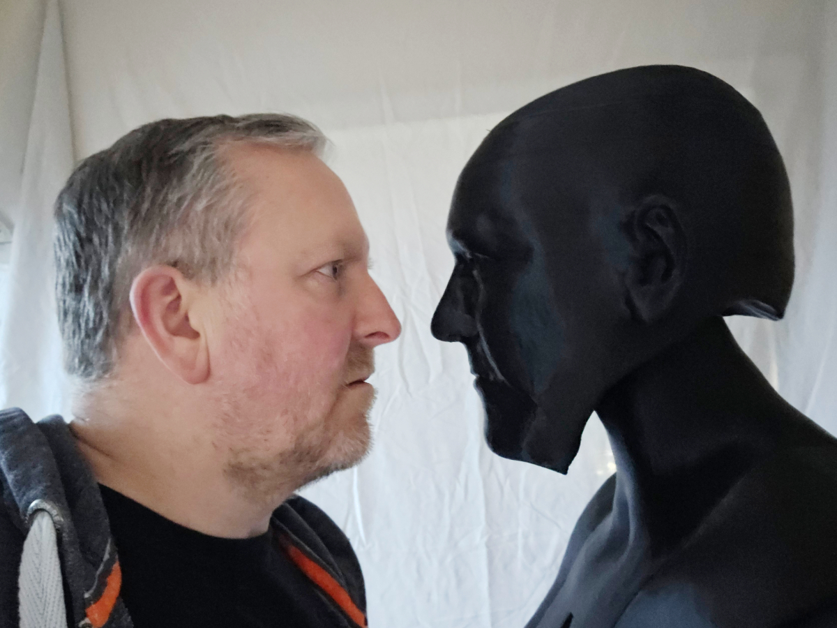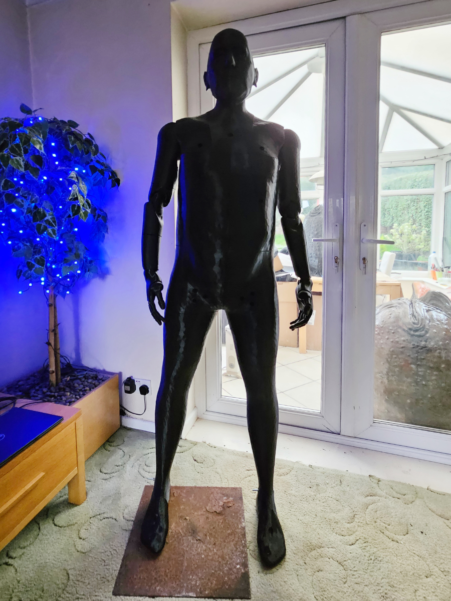 A 3D printed full size replica of a human figure with my approximate dimensions and likeness. Also featuring jointed arms, neck and hands.